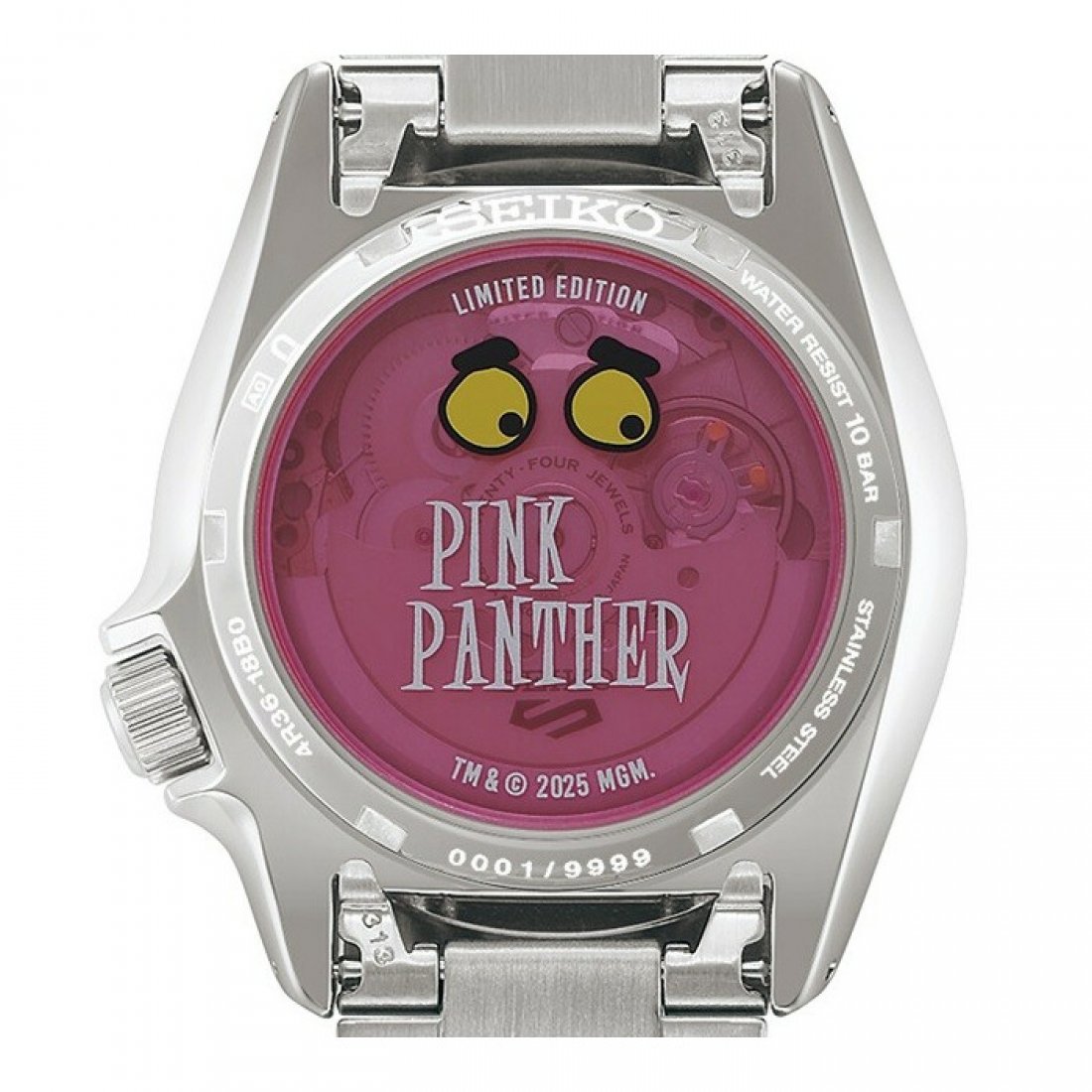 De Seiko SRPM07K1 Pink Panther Limited Edition is een speels en uniek horloge, wereldwijd gelimiteerd tot 9.999 stuks. De opvallende roze wijzerplaat is subtiel versierd met herkenbare Pink Panther pootafdrukken, wat dit model direct onderscheidend maakt. Het horloge wordt geleverd met een speciale Pink Panther NATO-band, die perfect aansluit bij het thema. Op de achterzijde bevindt zich een bijzonder roze glazen caseback met Pink Panther-design. Deze Limited Edition Seiko is een echte eyecatcher en een must-have voor verzamelaars en liefhebbers van iconische horloges met karakter.