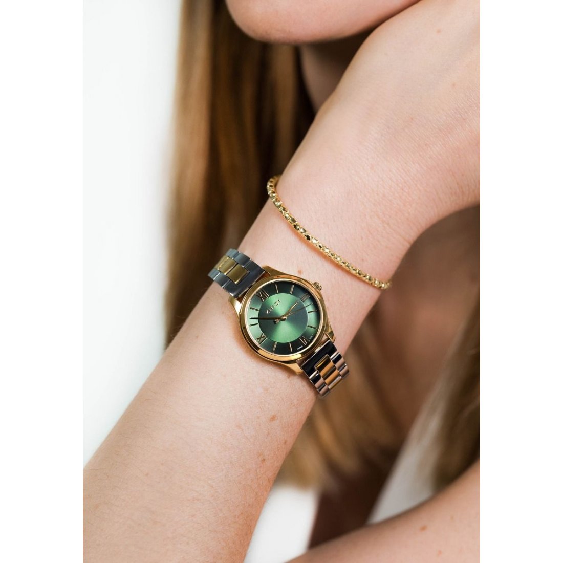 Voeg een vleugje luxe toe aan je pols met de Zinzi Classy Mini ZIW1235. Dit stijlvolle dameshorloge van 30 mm heeft een opvallende groene 'sunray' wijzerplaat, afgewerkt met Romeinse cijfers, en een bicolor stalen band. Dit elegante horloge is perfect voor elke gelegenheid en geeft elke outfit een stoere, maar chique twist.