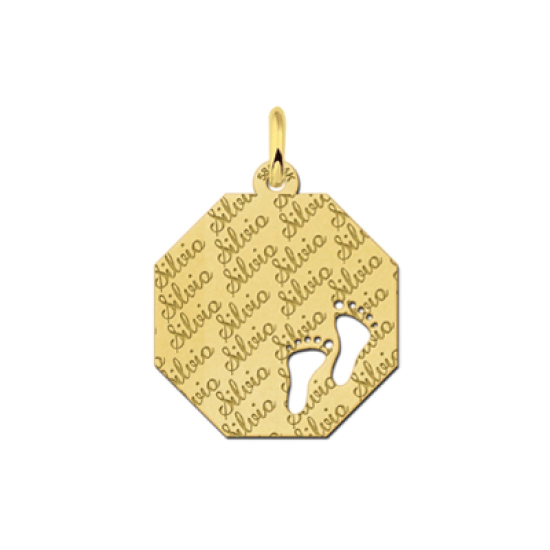Gouden achthoekige hanger met herhalende naamgravure en babyvoetjes symbool