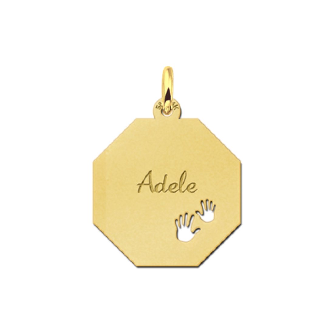 Gouden achthoekige hanger met naamgravure en babyhandjes symbool