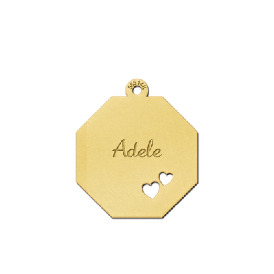Gouden achthoekige hanger met naamgravure en twee hart symbolen