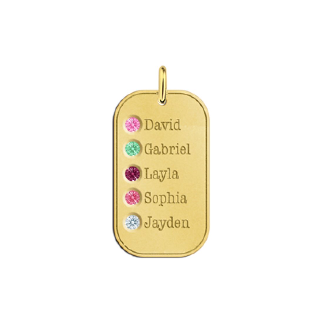 Gouden hanger met vijf namen en geboortestenen van zirkonia